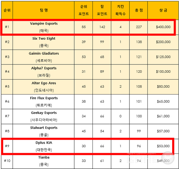 우승팀인 태국의 ‘뱀파이어 이스포츠’는 올스타 스테이지에서부터 총 4치킨을 획득하며 1위로 메인 토너먼트에 진출했으며, 메인 토너먼트에서도 4개의 치킨으로 총점 227점으로 2년 연속 PMWI 우승 트로피를 들어 올렸다. 총 6일간의 대회 일정 내내 1위를 단 한 번도 내주지 않으며, 그야말로 압도적인 경기력으로 대회를 지배했다. 올스타 스테이지와 메인 토너먼트 합산 총 54만 달러(약 6억 9천만 원)의 상금을 거머쥐었다.