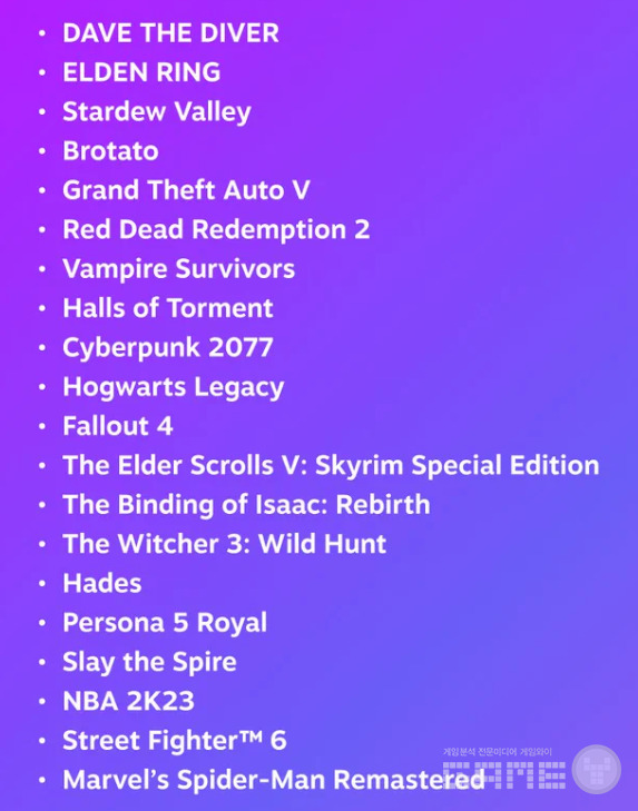 스팀은 2일 스팀덱 트위터를 통해 7월 스팀덱 상위 20개 게임을 플레이 시간별로 정렬했다. '데이브 더 다이브'가 1위, '엘든링'이 2위, '스타듀 밸리'가 3위, '브라타토'가 4위, 'GTA5'가 5위를 차지했다. 이어 '레데리2', '뱀파이어 서바이버', '홀즈 오브 토먼트', '사이버펑크2077', '호그와트 레거시' 등의 작품이 톱10에 들었다.
