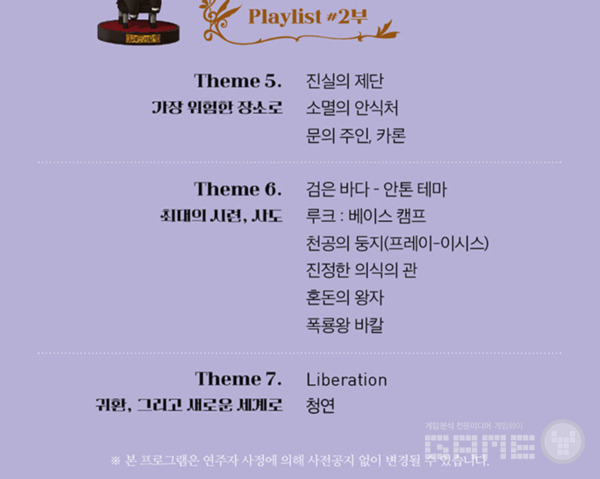 후반부에서는 ‘던전앤파이터’의 엔드 콘텐츠를 담당했던 안톤, 루크, 프레이-이시스, 시로코, 오즈마, 바칼 등의 사도 레이드에 대한 음악과 레기온 던전인 차원회랑의 음악, 천계 해방으로 유명한 Liberation과 선계 지역 음악인 청연이 연주될 예정이다.