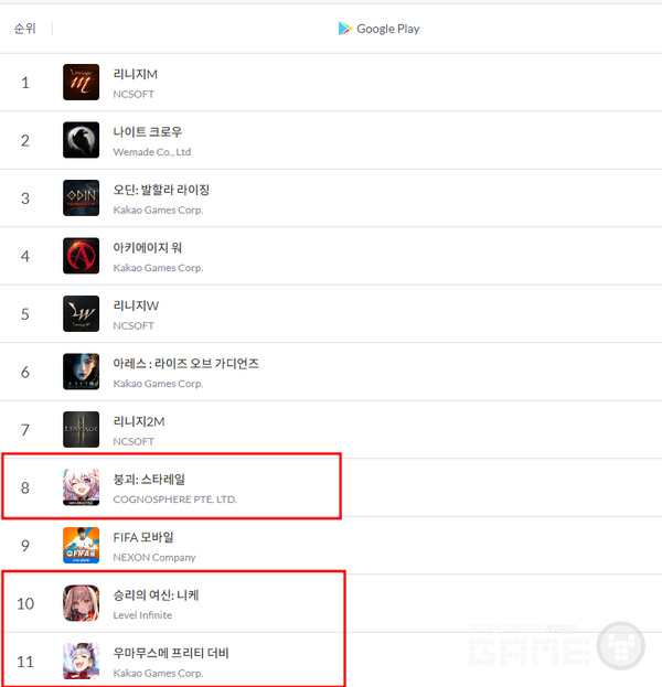 서브컬처 게임 3종이 신규 캐릭터 업데이트로 인한 효과를 보며 구글 플레이 매출 순위 10위권 안팎에 올랐다. 특히 '우마무스메'는 매출 순위 70위에서 11위에 오르며 이용자들의 큰 호응을 얻었다.