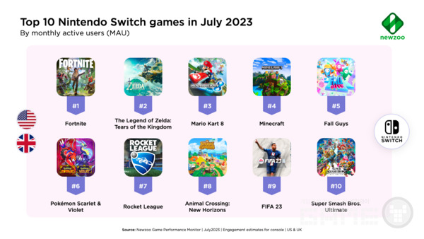 MAU 기준 스위치 최고 게임 중 절반은 자사 타이틀이었지만 에픽게임즈 및 EA와 같은 타사 스튜디오는 하이브리드 콘솔에서 많은 활동적인 플레이어를 끌어 들였다. 이 목록의 상위 5개 게임에는 닌텐도가 출시한 2개의 게임만 포함되어 있다.