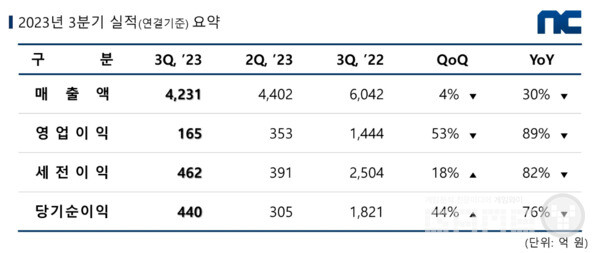 우선 엔씨소프트의 3분기 매출은 4,231억 원, 영업이익 165억 원, 당기순이익 440억 원을 기록했다. 전분기 대비 각각 4%, 53% 감소, 전년 동기 대비로는 30%, 89% 감소한 수치다. 당기순이익은 전분기 대비 44% 증가, 전년 동기 대비 76% 감소했다. 영업이익이 감소한 이유로는 신작 게임의 출시 준비를 위한 마케팅비 상승이라 말했다.