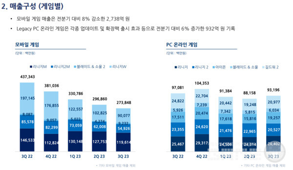 모바일 게임 매출은 총 2,738억 원을 기록했다. ‘리니지M’이 1,196억 원, ‘리니지W’는 901억 원, ‘리니지2M’은 549억 원, ‘블레이드 & 소울 2’는 92억 원을 기록했다.