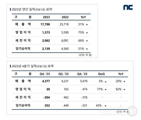 엔씨소프트의 지난해 4분기 매출액은 4,377억원으로 전년동기대비 20%가 감소했다. 영업이익은 38억원, 당기순이익은 252억원이다. 영업이익과 당기순이익은 전분기 대비 77%, 43%가 감소했다. 매출은 모바일 게임의 매출 증가로 전분기 대비 3% 증가했다.