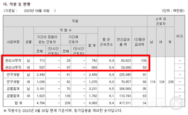 엔씨의 임직원은 2023년 3분기 기준, 4991명이다. 이중 1426명이 관리사무직이고, 3565명은 연구개발직으로 분류되어 있다. 관리 사무직이 전체 인원의 40%에 해당한다.