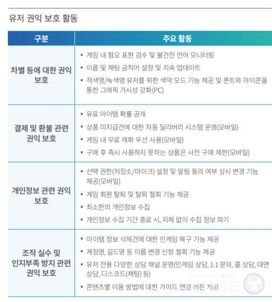업계에서 이용자 권익 보호 활동의 가장 대표적인 것으로 알려진 결제 및 환불 관련 권익 보호에는 유료 아이템 확률 공개, 상품 미지금건에 대한 자동 딜리버리 시스템, 게임내 무료 재화 우선 사용, 구매 후 즉시 사용하지못하는 상품은 사전 구매 제한 등의 항목을 주요 활동으로 들었다.