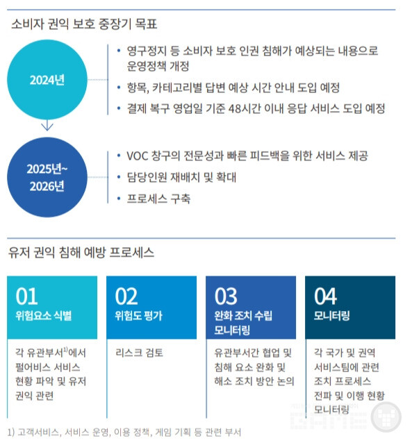 펄어비스는 소비자 권익 보홍 중장기 목표를 세워두고 있으며, 4단계에 걸친 이용자 권익 침해 예방 프로세스를 세워두고 있다.