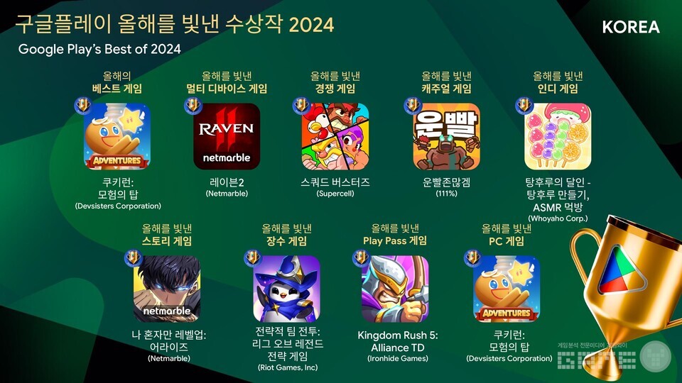 구글플레이는 매년 연말 각 나라별로 한 해 동안 가장 많은 사랑을 받으며 두각을 나타낸 앱과 게임을 선정해 다양한 항목별로 발표하고 있다. 2024년 전 세계의 '올해를 빛낸 수상작' 중 총 20개 부문에서 한국 개발사가 선정돼 모든 국가 중 가장 많은 수상을 거머쥐었다. 특히 게임 부문에서는 전체 어워드의 1/5 이상을 한국 개발사가 수상하는 성과를 올렸다.