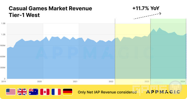 그 결과, 티어 1 웨스트 캐주얼 게임 시장은 전년 대비 11.7% 성장한 반면 다운로드 수는 4.1% 소폭 증가에 그쳤다. 최근 캐주얼 시장은 IAP 수익만 152억 달러에 달하며, 기회를 잡을 수 있는 광활한 바다와도 같다. 그렇다면 2025년에는 어디로 나아가야 하고 틈새 시장을 어떻게 선택해야 할까?