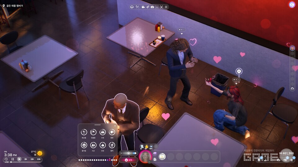'심즈' 시리즈에서는 서로 연인 관계가 되면 상대 쪽에서 열심히 애정공세를 퍼부어주지만 '인조이'에서는 유저가 직접 인터랙션을 하지 않으면 자발적인 애정행각이 없어서 아쉬웠다. 그래서 아쉬운 대로 나의 조이가 세레나데를 연주하고, 입맞춤도 하고, 공주님 안기까지 했다. 다시 말하지만 나의 조이는 여대생이고 상대는 중년 아저씨다!
