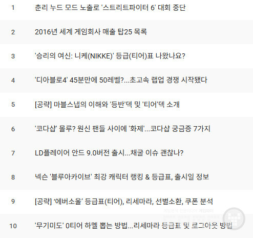 '승리의 여신: 니케(NIKKE)' 등급(티어)표 나왔나요?라는 기사는 2017년 이후 역대 3위 조회수를 기록할 정도로 인기 높았고, '코다샵' 몰루? 원신 팬들 사이에 '화제'...코다샵 궁금증 7가지, 넥슨 '블루아카이브' 최강 캐릭터 랭킹 & 등급표, 출시일 정보, [공략] ‘에버소울’ 등급표(티어), 리세마라, 선별소환, 쿠폰 분석 등의 기사가 톱10 안에 든 것을 보면 게임와이 내에서 미소녀게임, 서브컬처 타이틀의 인기가 높았다는 것을 잘 보여준다.