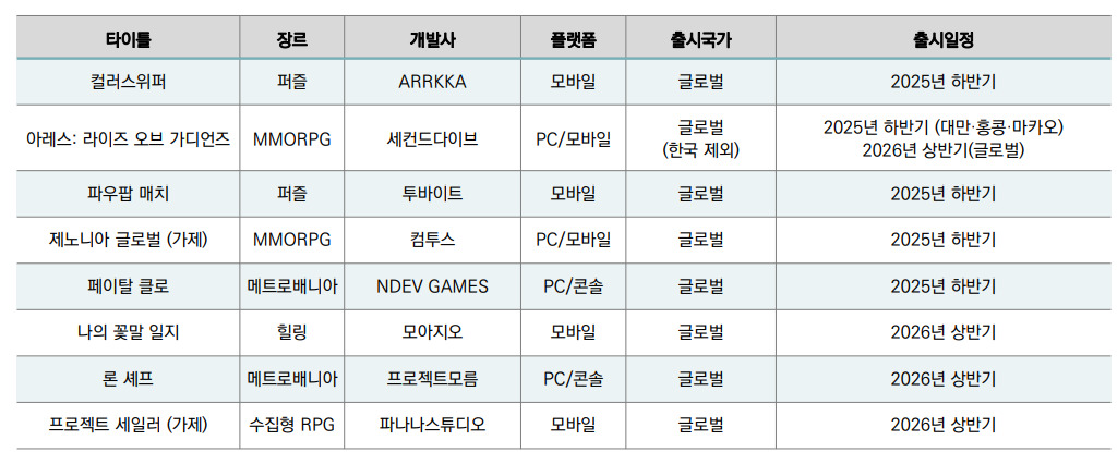이 외에도 지뢰찾기 규칙과 퍼즐 로직을 결합한 ‘컬러스위퍼’는 중독성 있는 퍼즐 게임의 재미를 한 차원 높인다. PC 및 콘솔로 선보일 메트로배니아 액션 RPG ‘페이탈 클로’도 탄탄한 스토리, 비주얼, 사운드, 조작감 등에서 우수한 평가를 받고 있어 기대감이 높다. 퍼즐 게임의 인기가 높은 북미 시장에 도전하는 ‘파우팝 매치’와 그래픽 및 게임성을 대대적으로 리뉴얼한 ‘제노니아’도 하반기 글로벌 출시할 예정이다.
