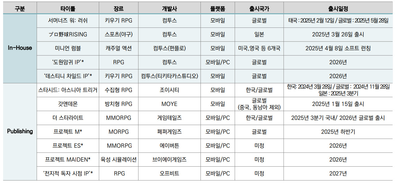 컴투스는 핵심 라인업의 장기 흥행 기반 위에 다양한 장르의 신작을 글로벌 시장에 선보이며 경쟁력을 지속적으로 확대할 계획이다. 글로벌 히트작 ‘서머너즈 워: 천공의 아레나’는 출시 11주년 기념 프로모션과 다양한 업데이트로, 야구 게임 라인업은 국내외 리그 개막과 함께 상승세를 타고 있으며, 일본 NPB 시장에도 지속적인 실적 성장을 이뤄간다는 목표를 가지고 있다.
