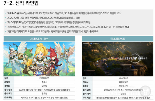 컴투스는 자체 개발과 퍼블리시응ㄹ 통해 차기작도 지속적으로 준비 중이다. 오는 28일 출시하는 서머너즈 워 IP 기반의 키우기 디펜스 게임 ‘서머너즈 워: 러쉬’를 시작으로 MMORPG ‘더 스타라이트’, MORPG ‘프로젝트M’(가칭)을 순차적으로 선보일 예정이다. ‘더 스타라이트’는 3분기 출시를 앞두고 오는 6월 사전 예약에 돌입할 예정이다.
