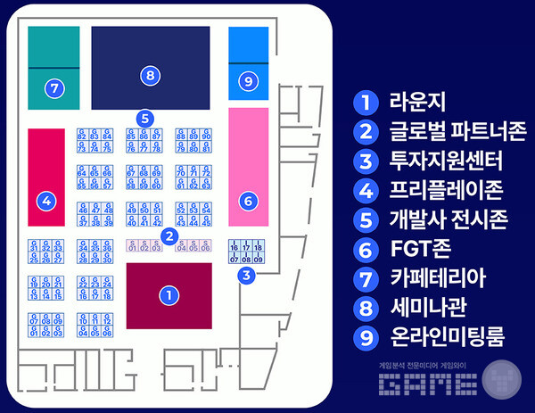 우선 B2B의 경우 개발사 전시존이 가장 가운데 자리잡고 있고, 하단에 글로벌 파트너존과 라운지가 자리하고 있다. 상단에는 카페테리아와 세미나관, 온라인 미팅룸이 있다. 좌우측에는 프리플레이존과 FGT존이 자리하고 있다.