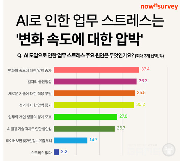 또한 AI로 인한 업무 스트레스 주요 원인은 무엇인가에 대한 답변으로는 변화에 대한 압박 증가(37.4%), 일자리 불안정성(36.3%), 새로운 기술에 대한 적응 부담(35.5%), 성과에 대한 압박 증가(35.2%)의 4개 답변이 가장 많은 것으로 나타났다.