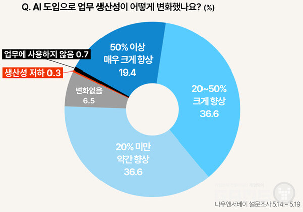 AI 도구를 ‘매일 1회 이상’ 사용하는 그룹의 67.4%는 ‘생산성이 50% 이상 크게 향상됐다’고 응답했으며, ‘주 1회 이하’로 사용하는 집단에서는 이 비율이 6.9%에 그쳤다. 이는 AI 사용 빈도와 업무 생산성 사이에 뚜렷한 연관성이 있음을 시사한다.