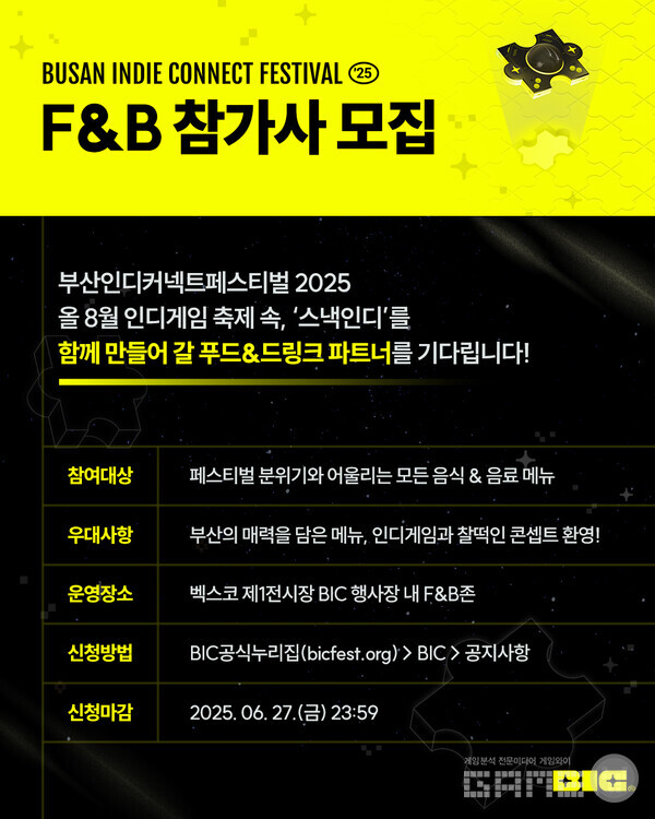 부산광역시, 부산정보산업진흥원과 부산인디커넥트페스티벌조직위원회(이하 BIC 조직위)는 오는 8월 15일부터 17일까지 부산 벡스코에서 열리는 ‘부산인디커넥트페스티벌 2025’(이하 BIC 2025)의 오프라인 행사에 참여할 F&B 참가사를 모집한다고 밝혔다.