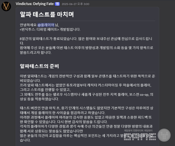 ‘빈딕투스’ 개발진은 “이번 글로벌 알파 테스트에 참여해주시고 소중한 피드백을 보내주신 모든 이용자 여러분께 진심으로 감사드린다”며 “부족한 점은 겸허히 받아들이고, 완성도 높은 결과물로 보답드릴 수 있도록 끊임없이 노력하겠다”고 전했다.