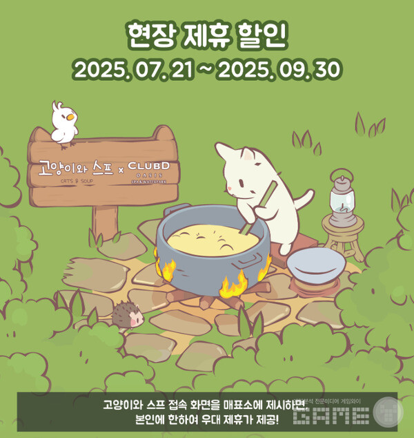 9월 30일까지 '고양이와 스프' 게임 접속 화면을 제시하는 본인에게는 클럽디 오아시스 입장료 최대 40% 할인 혜택을 제공한다. 모바일 게임 유저라는 것만으로도 현실에서 실질적인 혜택을 받을 수 있는 구조다.