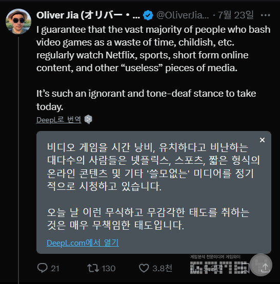 한편, 교토에 거주하는 일한 관계 전문 연구자 올리버 지아는 이 사건을 자신의 엑스 계정에서 언급하며 "공공장소에서 비디오게임을 하는 것은 '어린애 같다'고 여겨진다. 그러니 성숙한 어른답게 스마트폰에 매달려서 넷플릭스나 쇼트 비디오, 뇌를 썩게 만드는 틱톡 콘텐츠를 소비해야 맞냐?"고 비판했다.