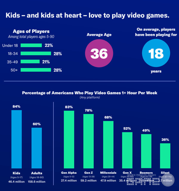 미국 엔터테인먼트 소프트웨어 협회(ESA)의 2023년 조사에 따르면, 미국 게이머의 평균 연령은 36세이며, 18세 이상 성인이 전체 게이머의 76%를 차지한다. 또한 전 세계 게임 시장 규모는 2023년 기준 약 1,845억 달러로 영화와 음악 산업을 합친 것보다 큰 규모다.