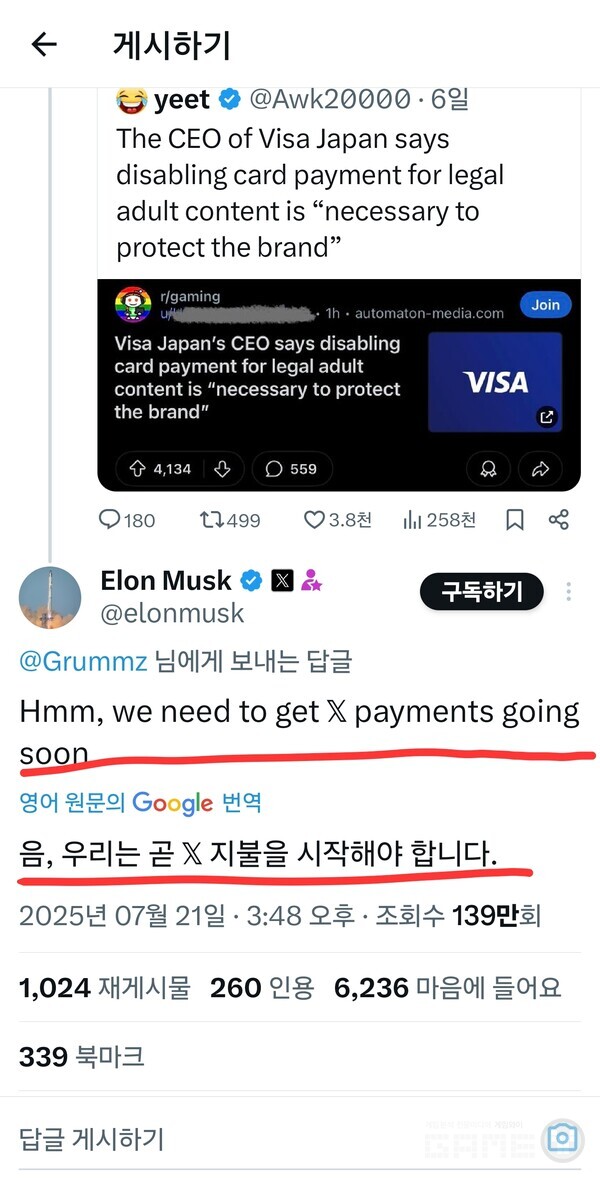 비자 재팬이 합법적인 성인 콘텐츠에 대한 신용카드 결제를 차단하는 것이 "브랜드 보호를 위해 필요하다"고 공식 발표하면서 큰 논란이 일고 있다. 이에 테슬라 일론 머스크가 해결사로 나설 가능성이 대두되고 있다.