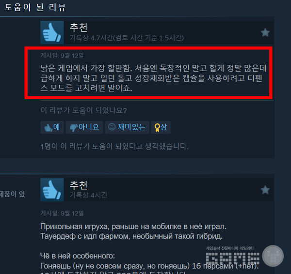 아직은 스팀 리뷰는 극히 적은 편이다. 반응은 나뉜다. 한국 유저는 "방치형 게임 중에는 가장 할만하다"며 긍정적 평가를 내렸고, 러시아 유저 역시 "타워디펜스와 아이들 파밍의 독특한 하이브리드"라며 1,133개 보유 게임 중 하나로 추천했다.