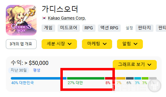 3개 게임을 한 자리에 놓고 보면 가장 먼저 출시된 더 스타라이트(노란색)이 최고 1일 6만 달러 수준의 매출을 찍고, 하락세가 시작됐다는 것을 알 수 있다. 이어 24일 가디스 오더가 출시되면서 더 스타라이트와 비슷한 수준의 매출을 기록했고, 다음날 R2 오리진도 소량의 매출을 기록한 것으로 나타났다. R2 오리진의 경우 29일 현재 한국 구글 매출 순위 68위에 랭크된 것으로 확인된다.