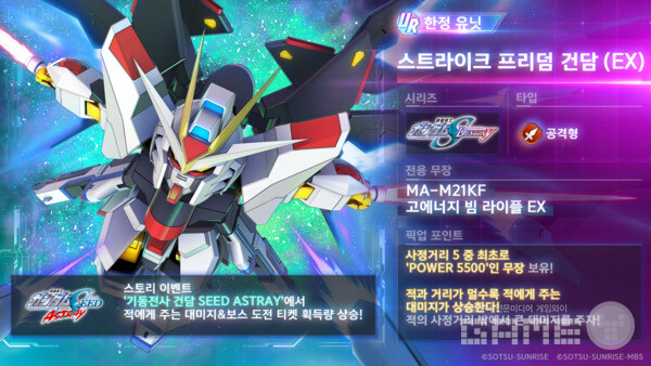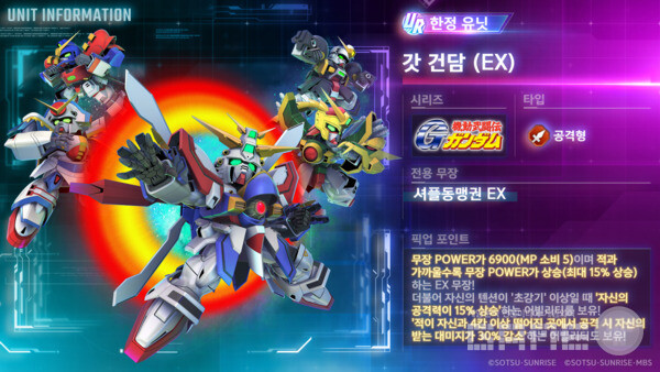 2025년 9월 30일 업데이트로 추가된 새로운 기체들 중 가장 주목받는 것은 단연 갓건담이다. 공격형 타입으로서 EX 무장의 화력이 8,000을 초과하는 압도적인 수치를 기록하고 있다. 적과의 거리가 가까울수록 무장 파워가 최대 20%까지 상승하는 특성을 지니고 있어, 근거리 전투에서 최강의 위력을 발휘한다.