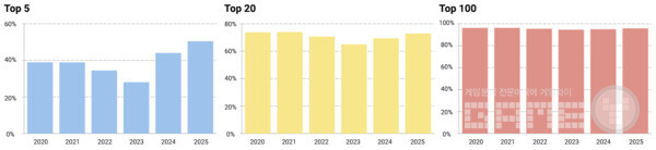 오랜 기간 시장을 주도해 온 기업들은 해마다 굳건히 자리를 지키며, 후발 개발자들의 돌파를 더욱 어렵게 만들고 있다. 특히 서구 개발사의 경우, 그들 프로젝트 중 상위 100위권에 진입하는 비율은 고작 25%에 불과하다.