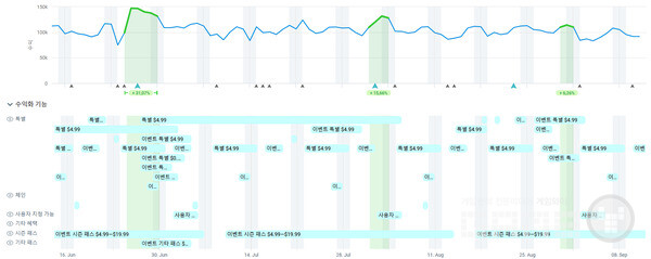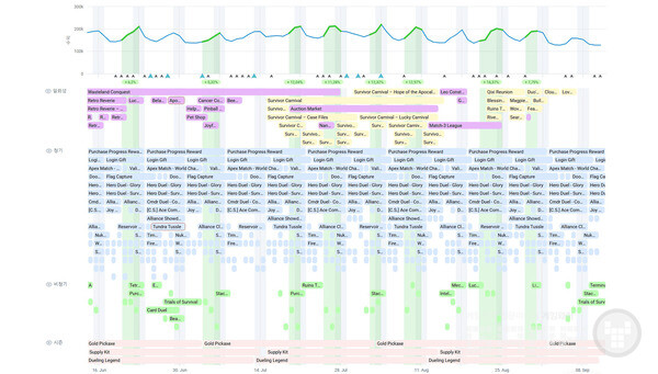 이러한 수익화 레이어들은 보통 풍부하고 체계적으로 구성된 라이브오프스 캘린더에 의해 뒷받침된다. 예를 들어 Puzzles & Survival의 이벤트 캘린더를 보면 빈틈이 전혀 없다! 동시에 최대 15개의 정기 이벤트가 진행되며, 시즌 마일스톤과 각종 비정기·일회성 이벤트가 더해진다. 이러한 강도 높은 이벤트 조합은 단순히 잔존율을 유지하는 것뿐 아니라, 이를 수익으로 전환하기 위해 설계된 것이다.