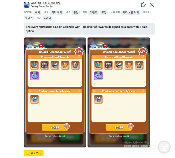 유저는 유료 옵션을 구매해 제한된 기간 동안 매일 접속 시 추가 보상을 받을 수 있다. 이러한 오퍼는 결제 이용자의 잔존율을 높이는 데 긍정적인 효과가 있으며, 동시에 비결제 이용자를 결제 이용자로 전환시키는 적절한 전환 포인트로도 작용한다.