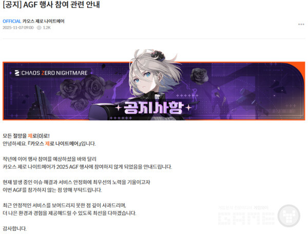 ‘카오스 제로 나이트메어’ 운영진 측은 공지사항을 통해 “현재 발생 중인 이슈 해결과 서비스 안정화에 최우선의 노력을 기울이고자 이번 AGF에 참가하지 못하게 됐다. 최근 안정적인 서비스를 보여드리지 못한 점 깊이 사과드리며, 더 나은 환경과 경험을 제공해드릴 수 있도록 최선을 다하겠다”라고 말했다.