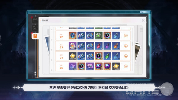 시스템 개선도 포함된다. 달성 수첩 2~22레벨 구간의 보상이 상향돼 초반 성장 구간의 보상 효율이 높아졌으며, 이미 완료한 이용자에게는 보정 보상이 우편으로 지급된다. 또한 전투 임무 6장이 새롭게 추가돼 노멀·하드 모드에서 확장된 전투를 즐길 수 있게 됐다.