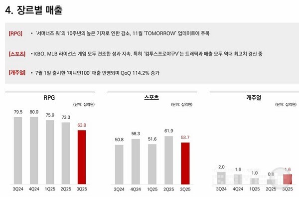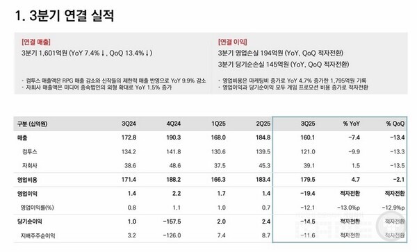 컴투스는 3분기 매출 1,601억원, 영업손실 194억원, 순손실 145억원을 기록했다. 올해 3분기까지의 누적 매출은 전년 동기 대비 약 1.9% 증가한 5,129억원을 기록했다. 다만 지난 9월 말, 신작 ‘더 스타라이트’ 출시를 앞두고 진행한 사전 마케팅 비용의 영향으로 3분기 영업이익은 감소했다. 컴투스는 향후 신작 매출 반영과 기존 주력 타이틀의 대규모 업데이트,다양한 프로모션 효과 등을 더해 실적 반등에 나선다는 계획이다.