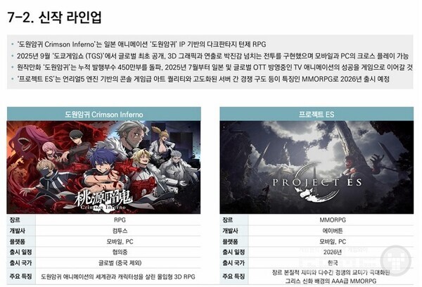 지난 9월 도쿄게임쇼에서 공개한 ‘도원암귀: 크림슨 인페르노’는 완성도 높은 시연 버전으로 호평을 받았다. 원작 애니메이션 스토리와 개성있는 캐릭터, 박진감 넘치는 전투를 통해 출시 전부터 높은 기대를 모으고 있다. 이외에도 김대훤 대표가 이끄는 에이버튼의 대형 MMORPG ‘프로젝트 ES(가칭)’과 ‘데스티니 차일드’ 기반 게임 등 경쟁력을 갖춘 신작 라인업으로 글로벌 시장을 공략할 예정이다.