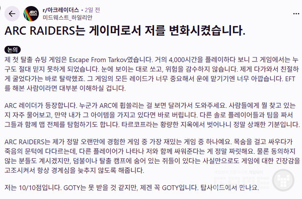 그런 그가 아크레이더스를 플레이하면서 180도 달라진 자신을 발견했다. "ARC(게임 내 AI 적)에게 공격받는 플레이어를 보면 달려가서 돕는다. 그들이 찾고 있는 아이템을 물어보고, 내가 갖고 있으면 드롭해준다"고 말했다. 심지어 우연히 마주친 솔로 플레이어와 즉석에서 팀을 구성해 함께 행동하기도 한다는 것이다. 그는 "타르코프의 황량한 지옥 같은 분위기를 겪은 후라 정말 신선한 기분"이라며 현재의 심경을 전했다. 그에게 아크레이더스는 "확실히 올해의 게임(GOTY)"이다.