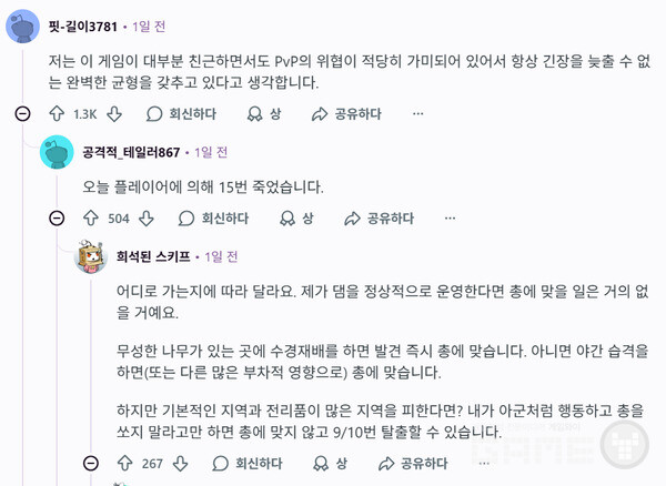 그의 게시글에는 많은 댓글이 달렸다. "주로 우호적인 분위기이면서도 PvP 위협이 충분히 존재해 긴장감이 유지되는 완벽한 밸런스"라는 평가가 많은 공감을 얻었다. 아크레이더스가 협력과 경쟁의 균형을 잘 맞췄다는 것이다. 다만 모든 경험이 우호적이지만은 않다는 반론도 있었다. "오늘 플레이어들에게 15번 죽었다", "함께 적을 물리치다가 전리품을 두고 모두가 나를 공격했다"는 식의 배신 경험담도 나왔다.
