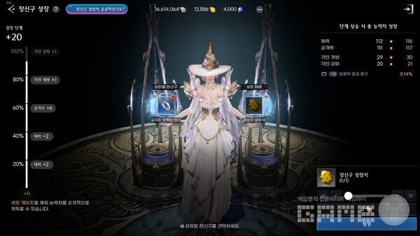 장신구 강화는 경험치 기반 게이지 구조가 적용돼 있으며, 25%·50%·75% 구간에서 일부 옵션이 먼저 적용되고, 100% 도달 시 단계 상승이 이루어진다. 캐릭터 성장 전반은 원작의 요소를 모바일 기준으로 재구성한 형태다.