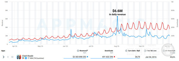 올해 9월은 슈퍼셀이 2016년에 출시한 실시간 전술 게임 클래시 로얄(Clash Royale)의 새로운 일일 매출 정점을 기록했다. 9년 된 타이틀이 이렇게 강력하게 회복하는 것은 흔치 않다. 이 게임은 단 하루에 660만 달러를 벌어들여, 글로벌 출시 직후에 세운 일일 매출 490만 달러의 기존 기록을 경신했다.