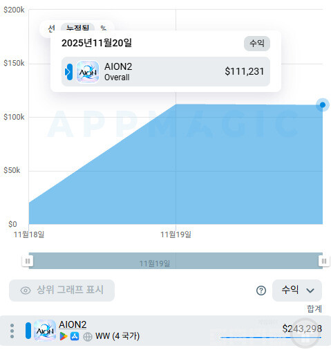 실제로 모바일 앱 시장 분석 플랫폼 앱매직에 따르면 아이온2의 20일 기준 글로벌 모바일 수익은 24만3298달러(약 3억4000만 원)로 집계됐다. 이는 애플 앱스토어와 구글 플레이스토어 수수료 30%를 제외한 개발사 순수익으로, 모바일 앱마켓 총 매출로 환산하면 약 4억8000만 원 수준이다.